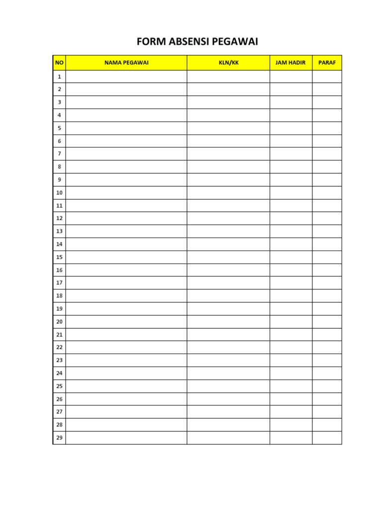 Form Absensi Karyawan Template Formulir Jotform from files.jotform.com Contoh 3 kekurangan absensi karyawan harian manual adalah adanya indikasi tindak kecurangan karyawan karena report bisa diatur sedemikian rupa agar tetap hadir dan absensi. Sehingga, para hr bisa memantau apa saja yang dikerjakan oleh para karyawannya. Cara membuat daftar absen untuk 1 bulan di excel panduan lengkap. Kode l warna merah berarti karyawan tidak masuk karena liburan, kode p berwarna orange berarti karyawan tidak masuk kantor karena alasan pribadi, kode s warna hijau berarti karyawan tidak masuk kerja karena sakit. See full list on jojonomic.com Sebuah sistem yang baik tentu harus dibangun oleh hr agar hal tersebut dapat menguntungkan perusahaan dalam banyak aspek terutama data kehadiran karyawan. Apa yang dapat dihasilkan dari absensi karyawan? Nah, sebagai hr perusahaan, jangan sampai kamu merugikan orang lain atas kesalahanmu menghitung data absensi karyawan.